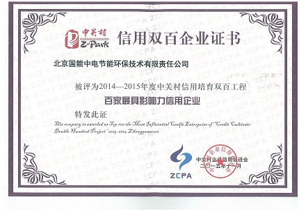 2015年11月16日,由中國人民銀行、市經(jīng)濟和信息化委、中關(guān)村科技園區(qū)管理委員會、中關(guān)村企業(yè)信用促進(jìn)會等多家企業(yè)、協(xié)會組織聯(lián)合發(fā)起召開的“信用中關(guān)村”系列活動暨2015中關(guān)村信用雙百企業(yè)發(fā)布會在北京舉行。我公司被評選為2014~2015年度中關(guān)村信用培育雙百工程“百家最具影響力企業(yè)”。