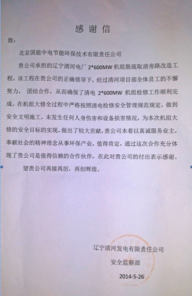 在公司總部的正確領導下,經過遼寧清河電廠2*600MW機組脫硫取消旁路改造工程項目部全體員工的共同努力,確保了該工程業(yè)主安全目標的順利實現(xiàn),受到業(yè)主公司安全監(jiān)察部表揚,也充分體現(xiàn)了我們國能中電是值得信賴的合作伙伴。