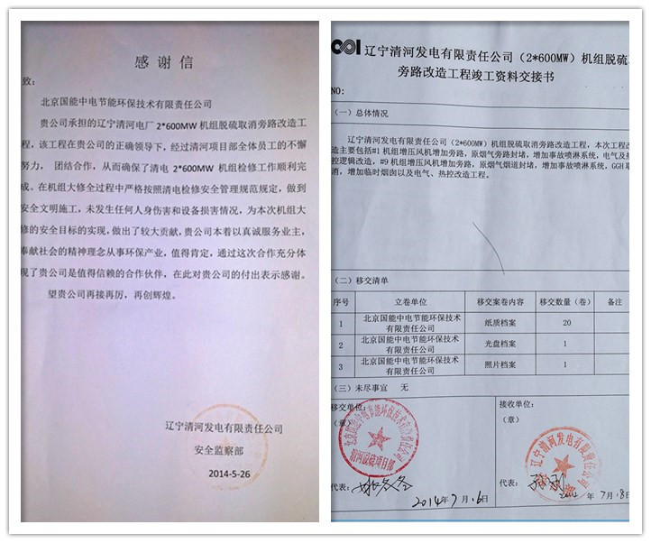 在公司總部的正確領(lǐng)導(dǎo)下,經(jīng)過清河EPC旁路改造項目部全體成員的共同努力,7月18日,遼寧清河發(fā)電有限責(zé)任公司業(yè)主代表在竣工資料交接證書上簽字,標(biāo)志著我公司承擔(dān)的遼寧清河電廠2*600MW機組脫硫取消旁路改造工程正式竣工驗收,成功打響了我司在中國電力投資集團的第一槍。